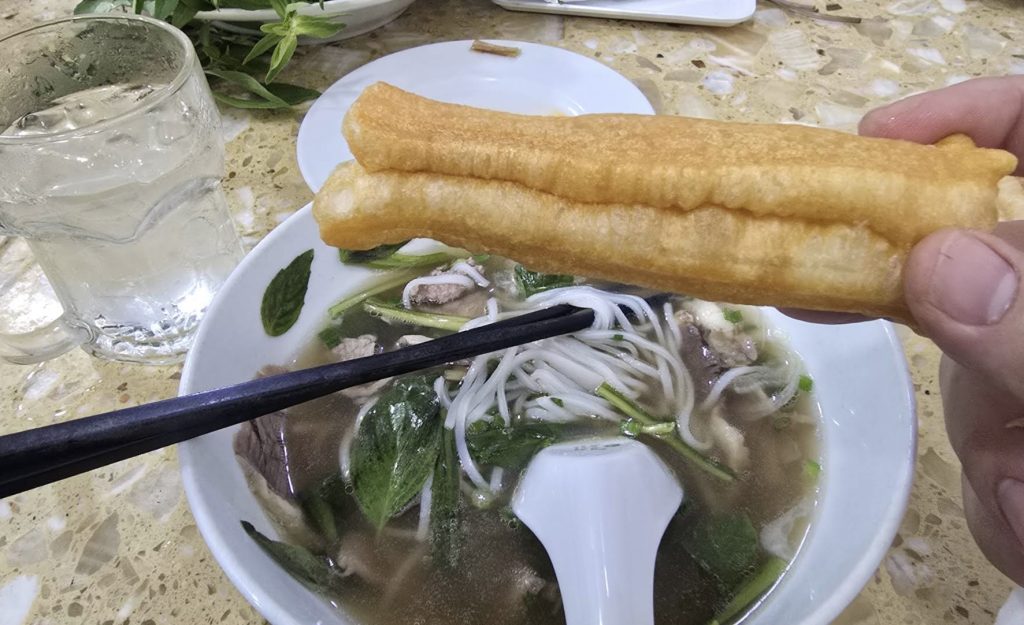 The north do two types of Pho, Beef and Chicken, whereas southerners primarily do beef pho. The northern style beef pho puts an emphasis on the beef flavor of the broth, often using less spices and is less sweet (no rock sugar added whatsoever). Chao Quay – fried savory asian donuts are used as a topping as well.