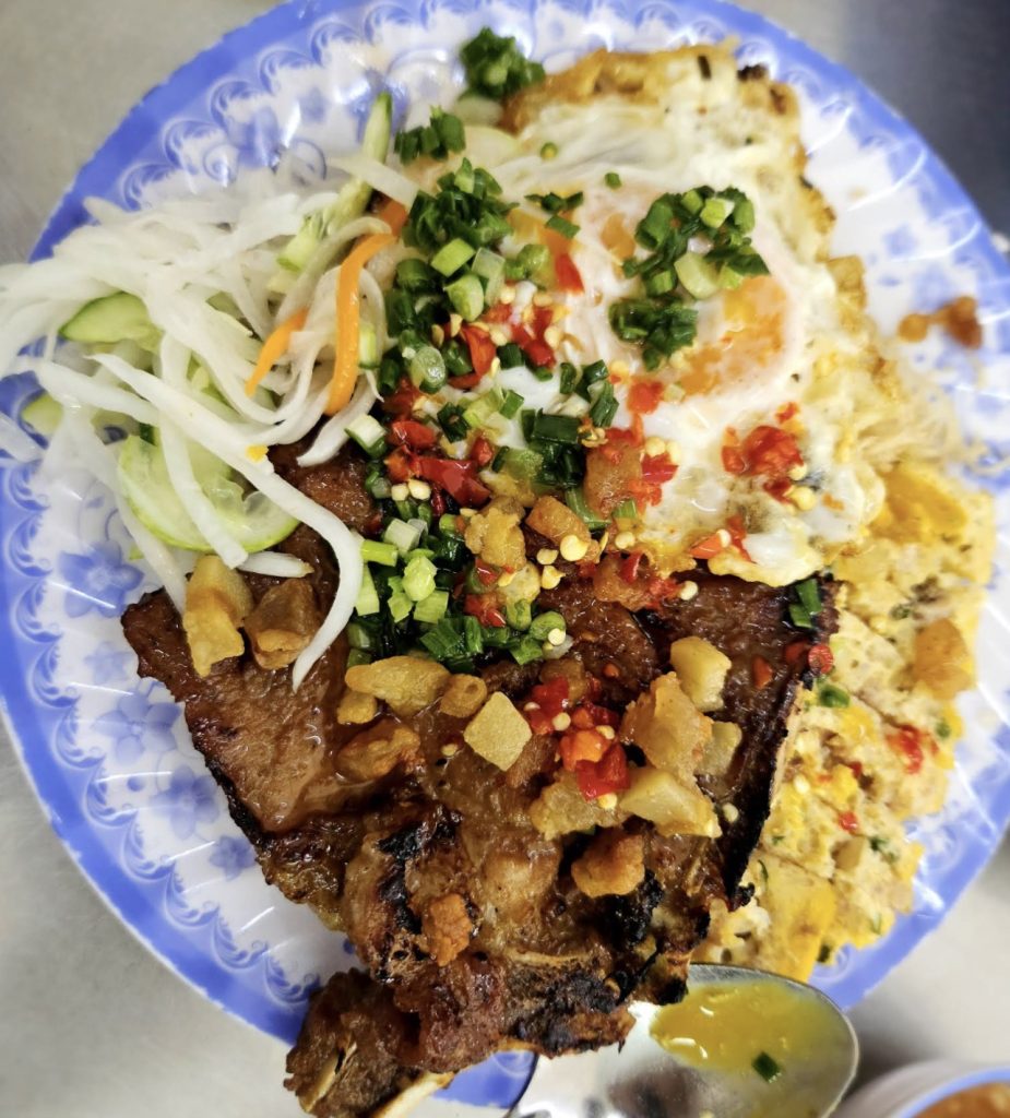 This place grills their pork chops BONE IN which results in a juicy cut of pork. The marinade permeates deep into the meat so the flavors come through in every bite. This is a little off the beaten path and not as well known so you’re not going to have to wait too long for a plate of com suon hopefully, though they have recently become very popular on the Grab app. I highly recommend getting a fried egg and asking them to have the yolk a bit runny. This elevates the dish even more than it already is. Keep in mind that the pork ribs are more expensive than the pork chops, though both are worth trying at some point.